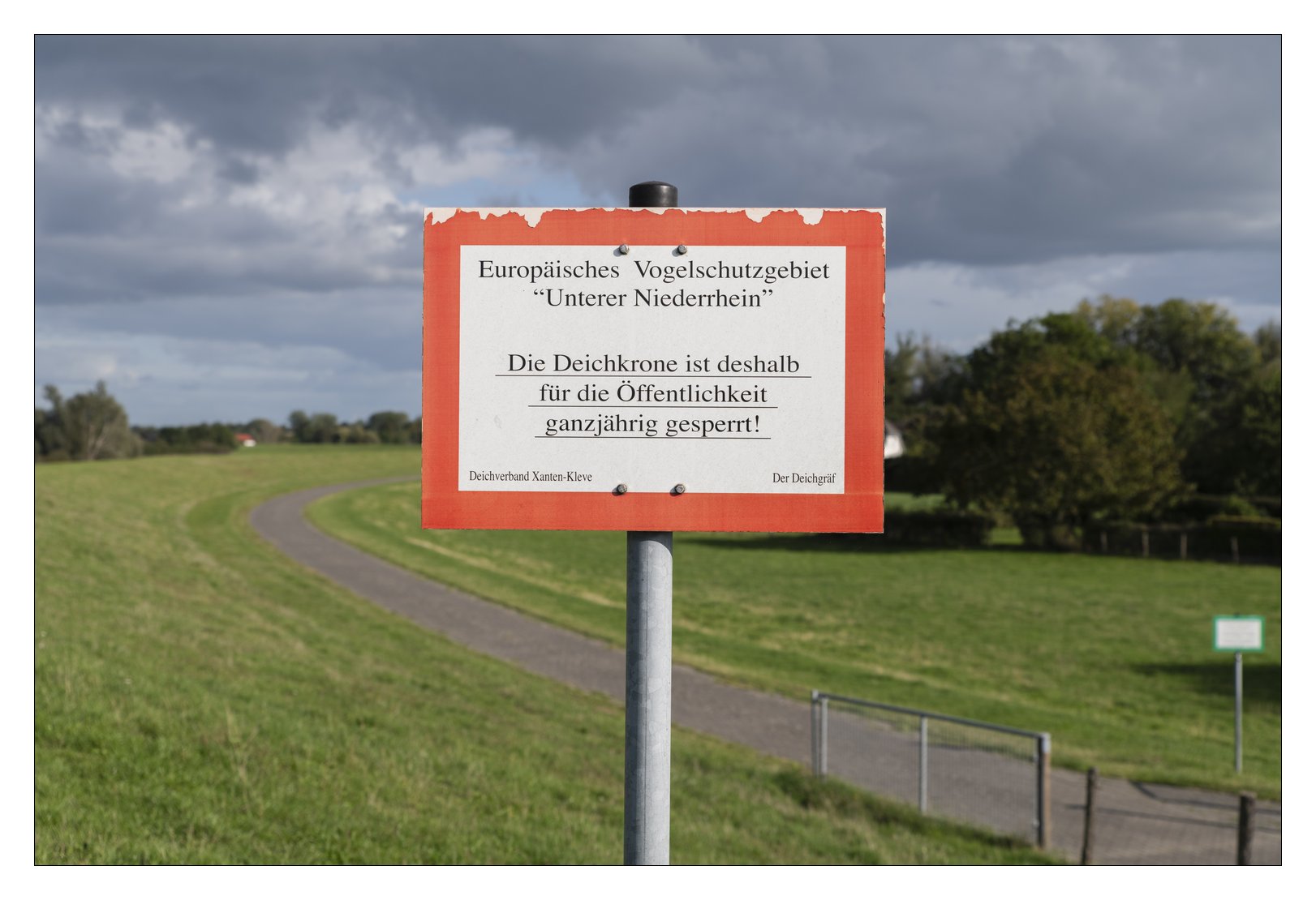 Schon in der Vorbereitung war klar, dass dies ein anderer Abschnitt werden würde. Viele Wege sind hier gesperrt – Deichkronen dürfen aus Gründen des Hochwasserschutzes nicht betreten werden, ganze Strecken verlaufen hinter dem Deich oder weit im Landesinneren. Meistens nur in Orten wie Büderich, Vynen, Grieth oder Bimmen kommt man überhaupt an den Rhein heran. Dazwischen liegen großflächige Naturschutzgebiete. So wurde aus dem Weg entlang des Flusses ein Weg entlang der Vorstellung vom Fluss – sichtbar wenn überhaupt nur in der Ferne, meist hinter dem Deich, hinter Böschungen, Weiden, Straßen.