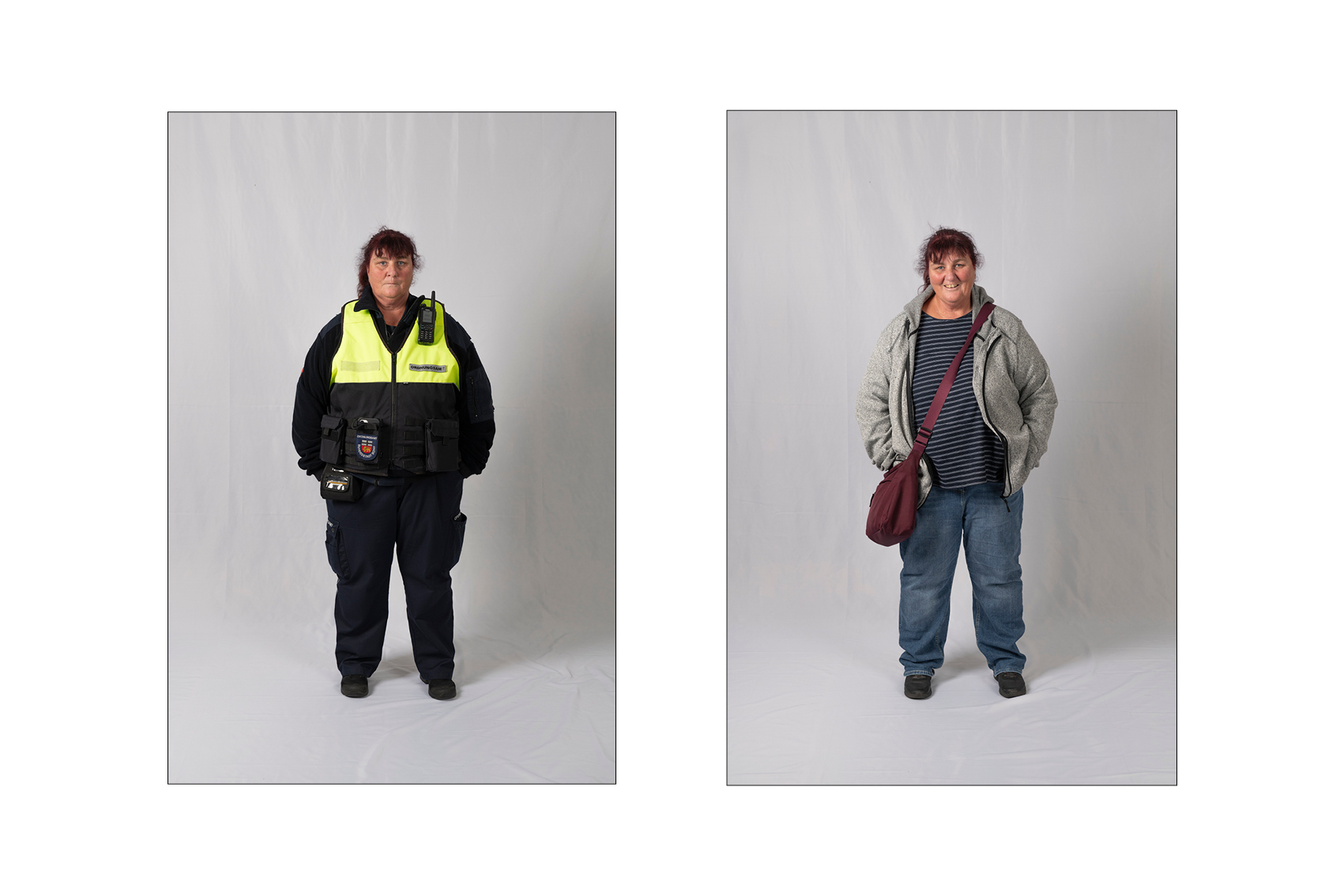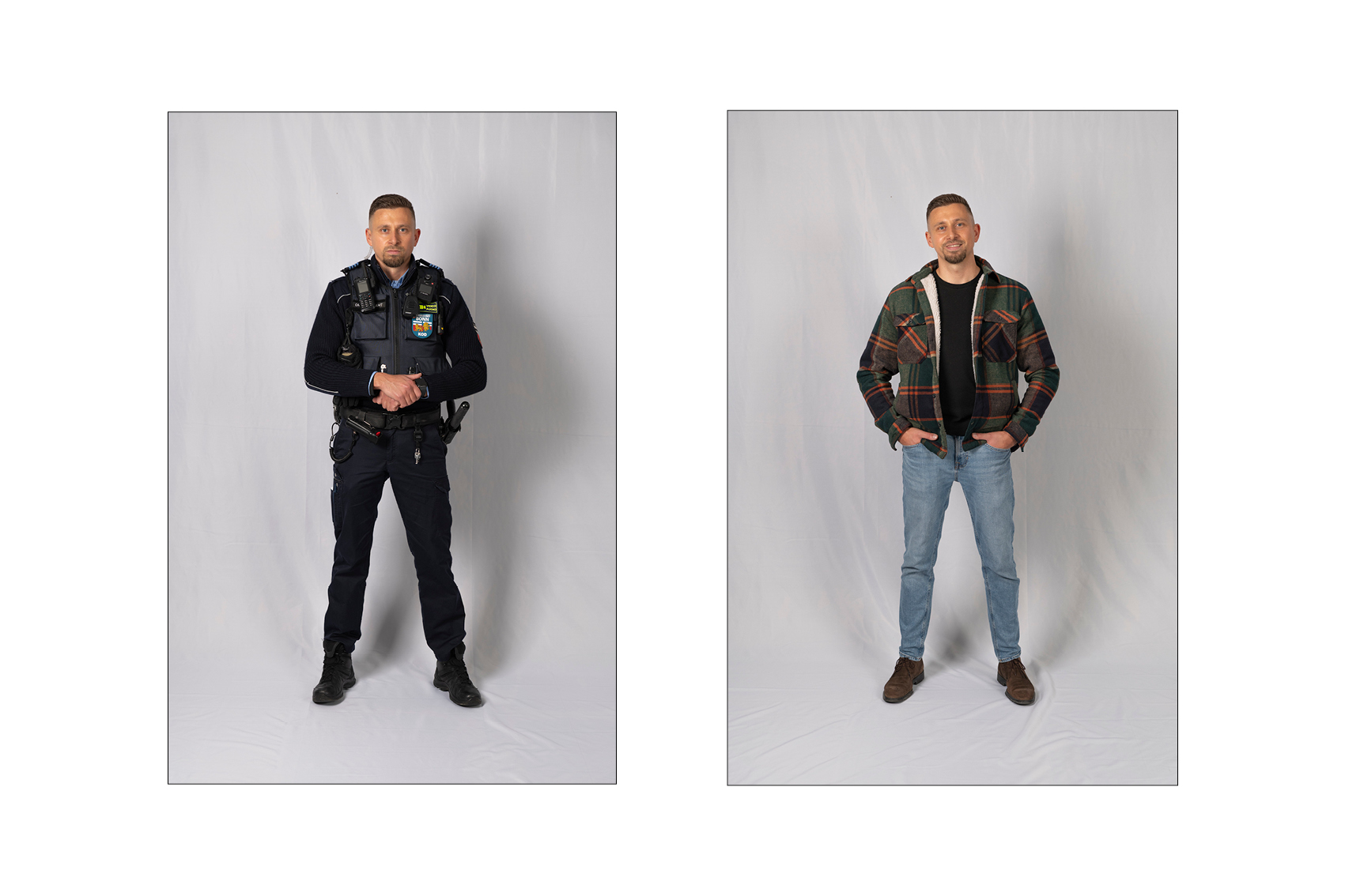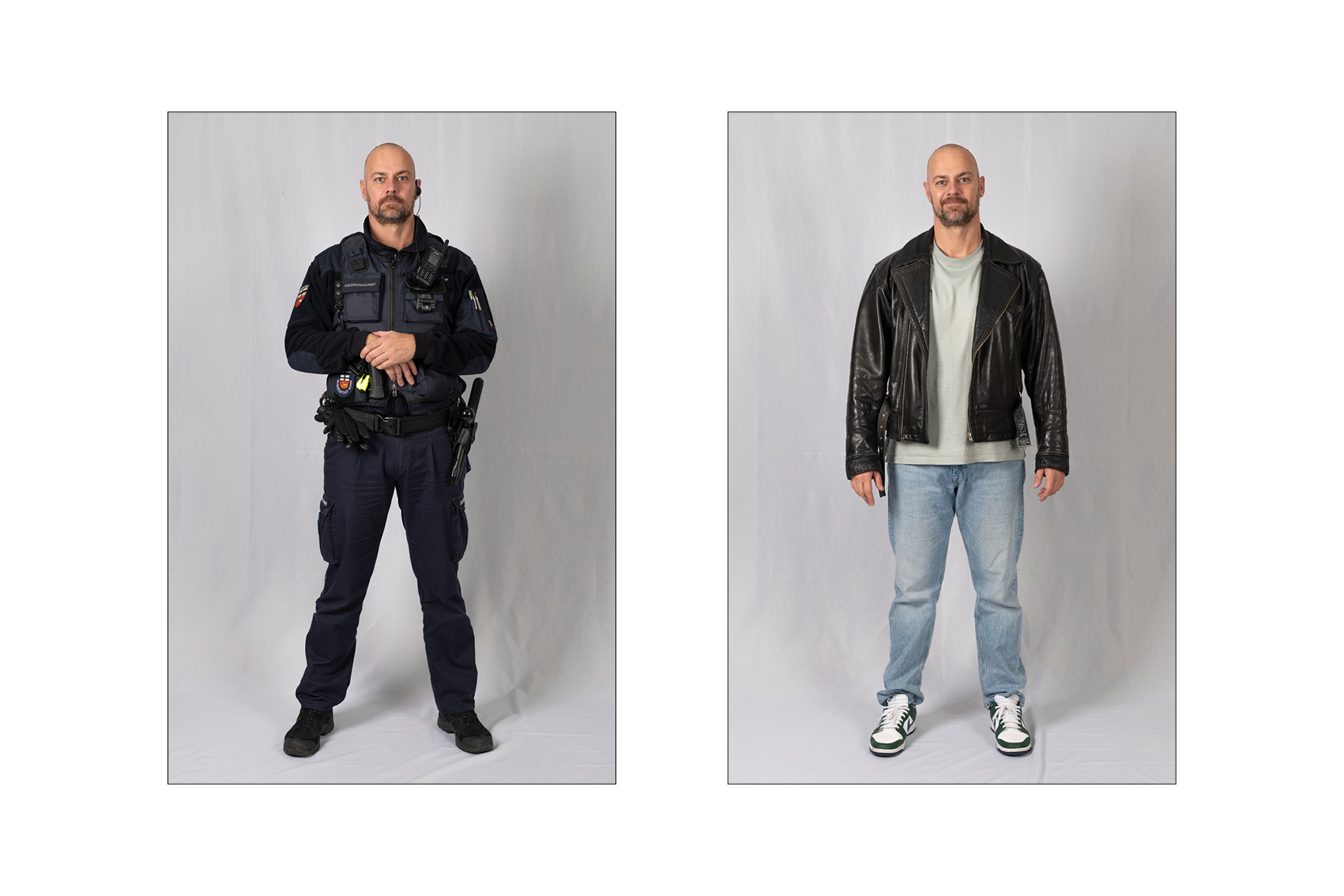Die Idee für die Doppelporträts entstand beinahe automatisch, kurz nachdem ich begonnen hatte, den Kommunalen Ordnungsdienst zu begleiten. Immer wieder fiel mir auf, wie sehr sich der Eindruck von den Menschen verändert, sobald die Uniform ins Spiel kommt: Aus vertrauten Menschen werden Vertreterinnen und Vertreter eines Amtes. Die Uniform schützt, strukturiert, schafft Distanz – und lässt vieles Persönliche im Hintergrund verschwinden.