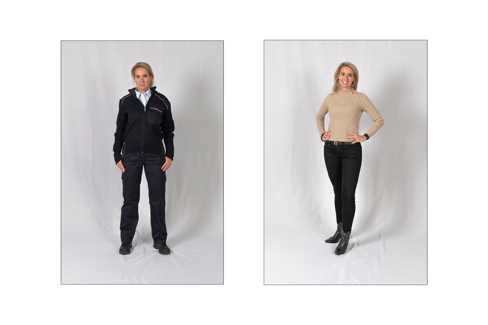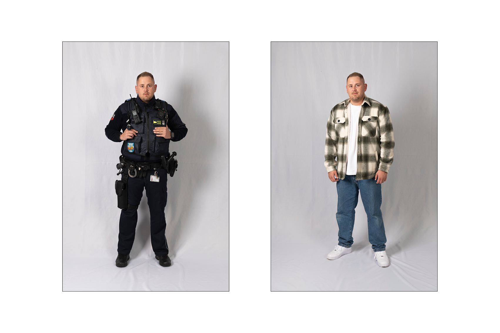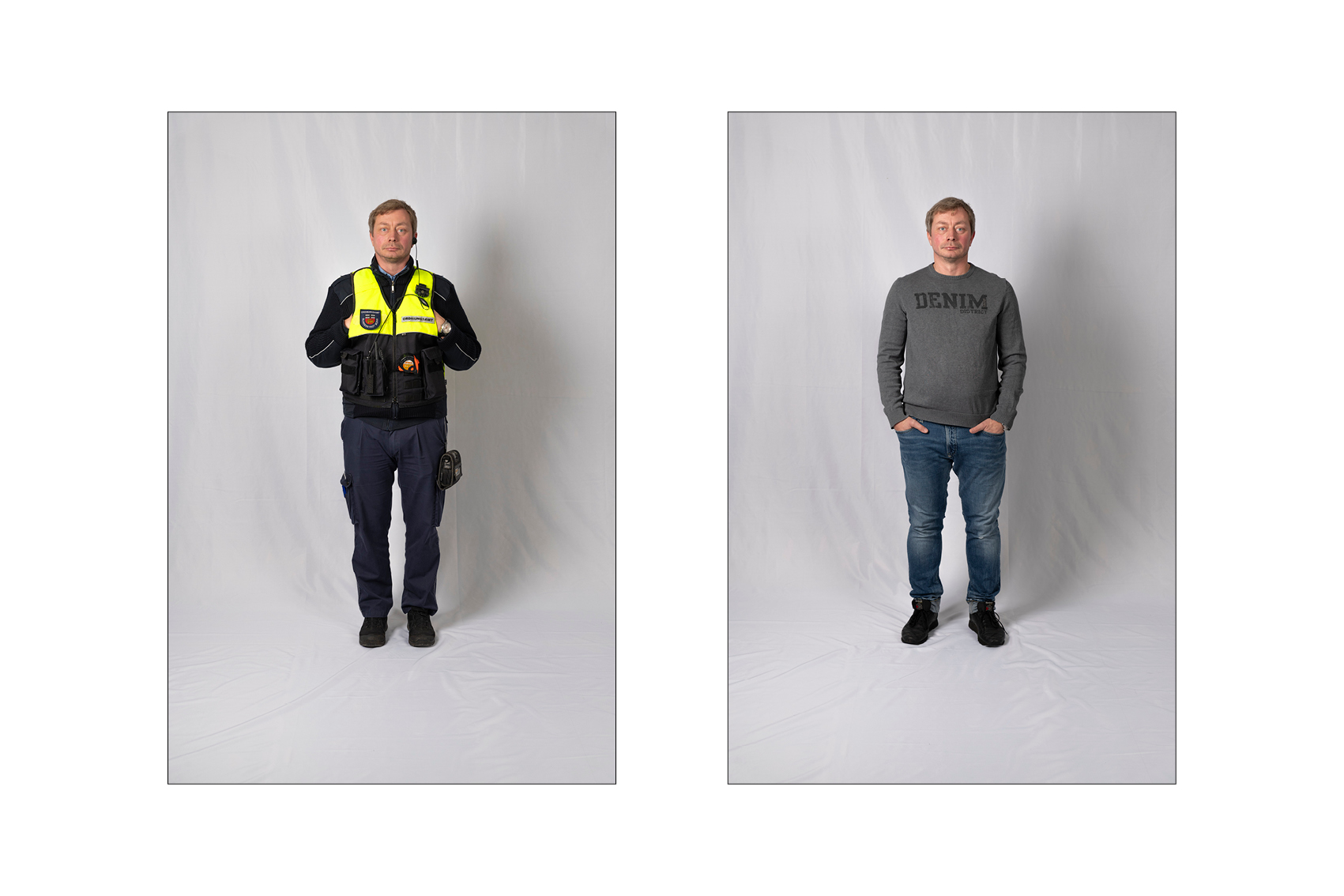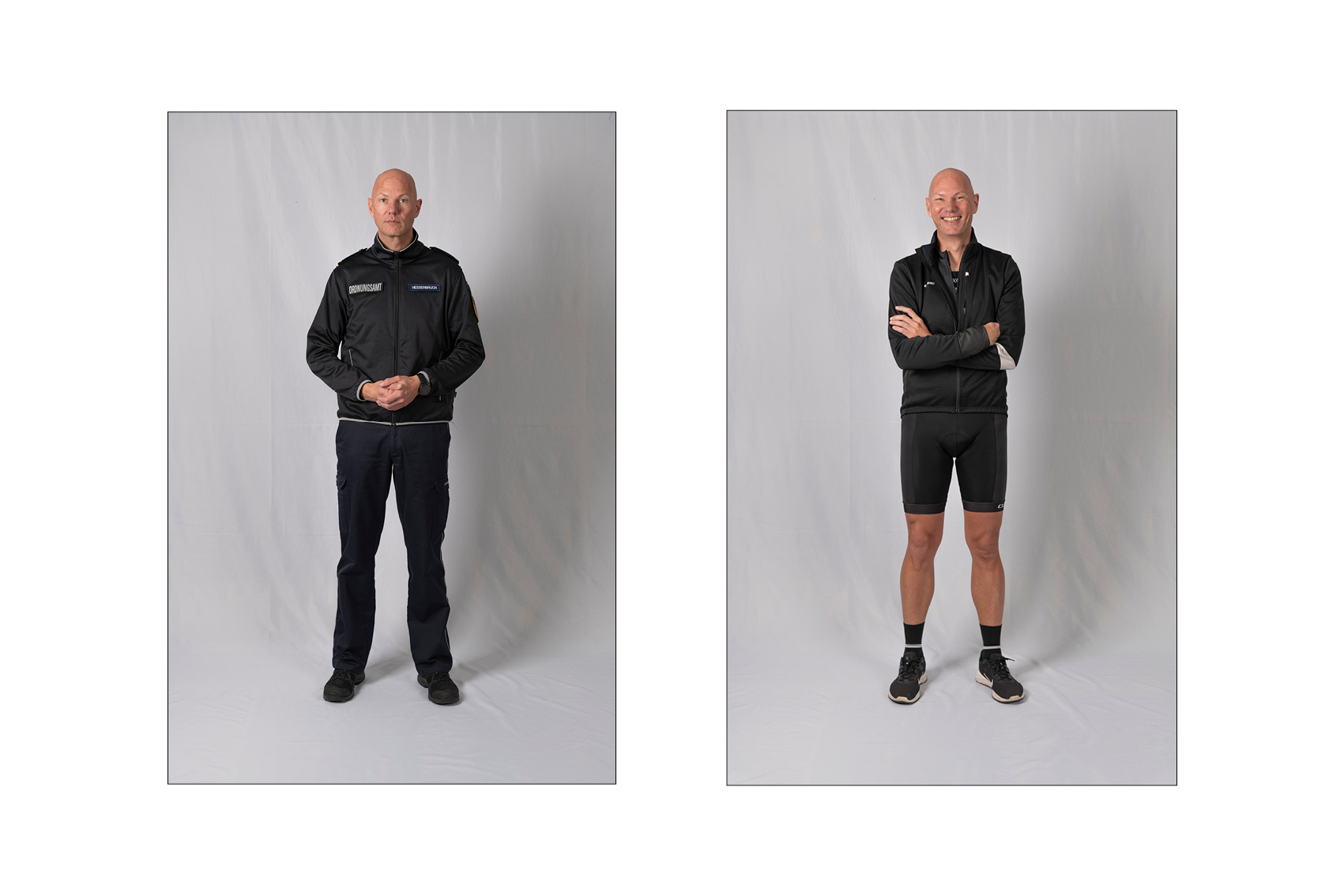 Die Idee für die Doppelporträts entstand beinahe automatisch, kurz nachdem ich begonnen hatte, den Kommunalen Ordnungsdienst zu begleiten. Immer wieder fiel mir auf, wie sehr sich der Eindruck von den Menschen verändert, sobald die Uniform ins Spiel kommt: Aus vertrauten Menschen werden Vertreterinnen und Vertreter eines Amtes. Die Uniform schützt, strukturiert, schafft Distanz – und lässt vieles Persönliche im Hintergrund verschwinden.